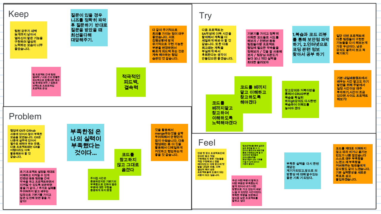 초기 프로젝트 설정을 제대로 이해하고 지켜질 수 있게 컨벤션 등등 팀원들 간에 약속을 하고 프로젝트하면서 지켜질 수 있도록 보완하면 좋을 거 같다. / 추가로 실패를 두려워하지 말고 배우는 입장으로 기본기를 가지고 많은 도전해 보면 좋을 거 같다.