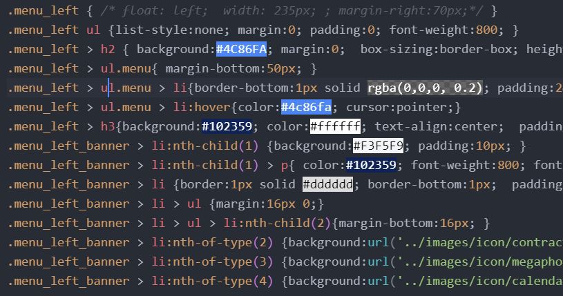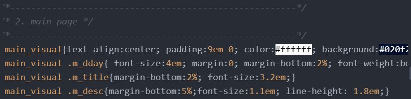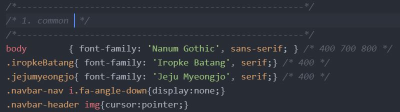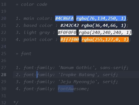 컬러코드, 폰트등 자주사용하는 값들을 CSS 파일 윗부분에 적어두고 참고하며 작업을 진행하면 아주 편리합니다. 많이 쓰니까 자연스럽게 외워지기 마련이지만 실제로 저는 "컬러가... #4C...뭐였더라.." 하는 경우가 늘상 생기기 마련입니다. 컬러 코드와 사용한 폰트의 목록을 명시해두면 더 일관성 있고 매력적인 디자인을 하는데 도움이 됩니다.