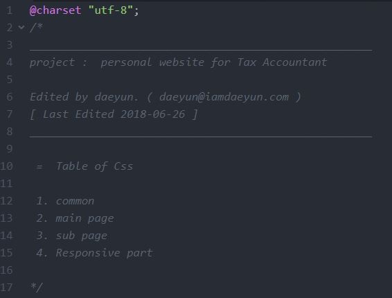 그 아래에는 목차를 넣어서 이 CSS파일이 포함하고 있는 내용들에 대해서도 간략히 설명해주면 자세히 살펴보기전에 어느부분을 들여다 보면 좋을지 파악이 쉽겠습니다.
